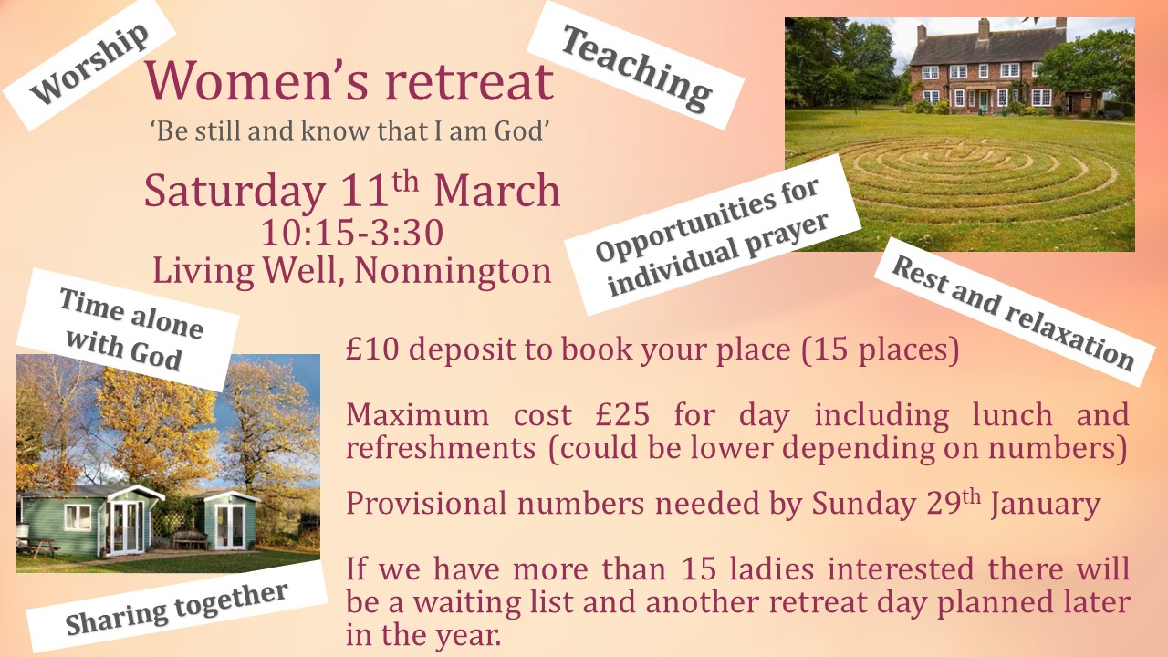 We are planning a women’s retreat on Saturday 11th March at the Living Well centre in Nonnington. A time to be still and know that God is God. There will be worship, teaching, sharing together, lunch, opportunities for individual prayer, time for rest and relaxation, to be still.