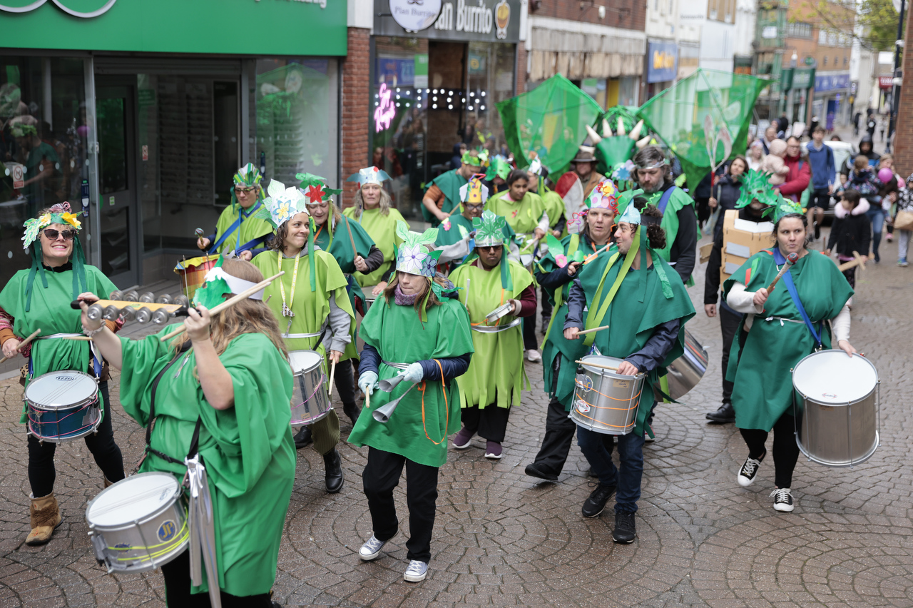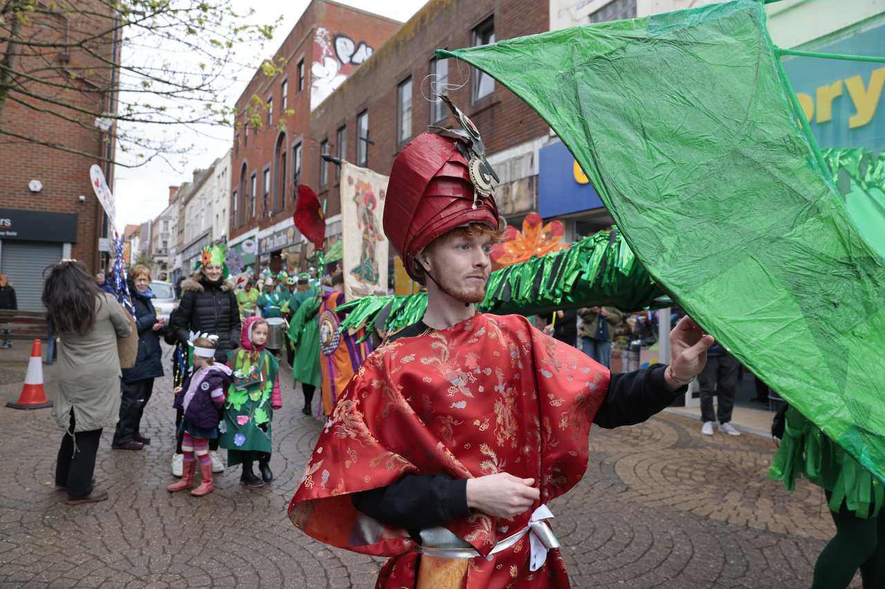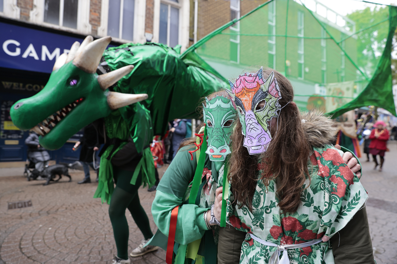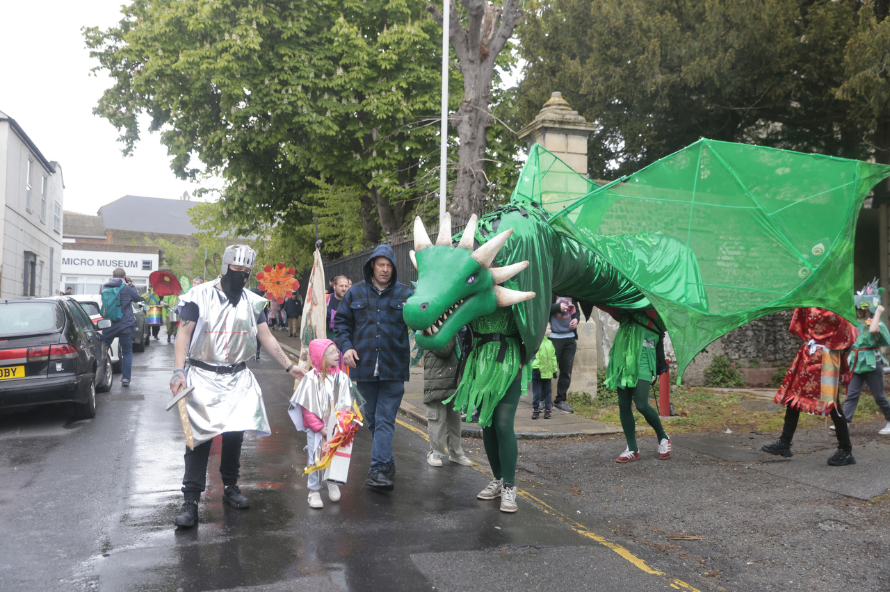 After a joint service with St Luke’s the parade set off on a tour of the town centre, led by our enormous green dragon blowing smoke from her nostrils.